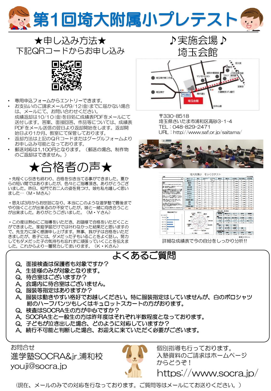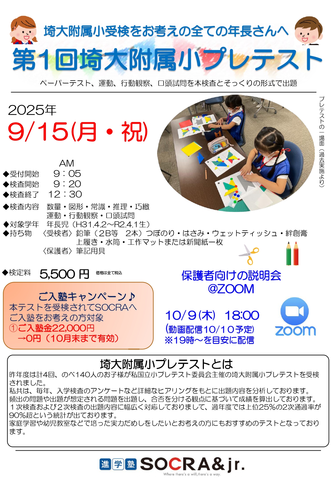 進学塾SOCRA&jr.では、今年受験を迎える年長さんを対象に、「第1回埼大附属小プレテスト」を実施いたします。