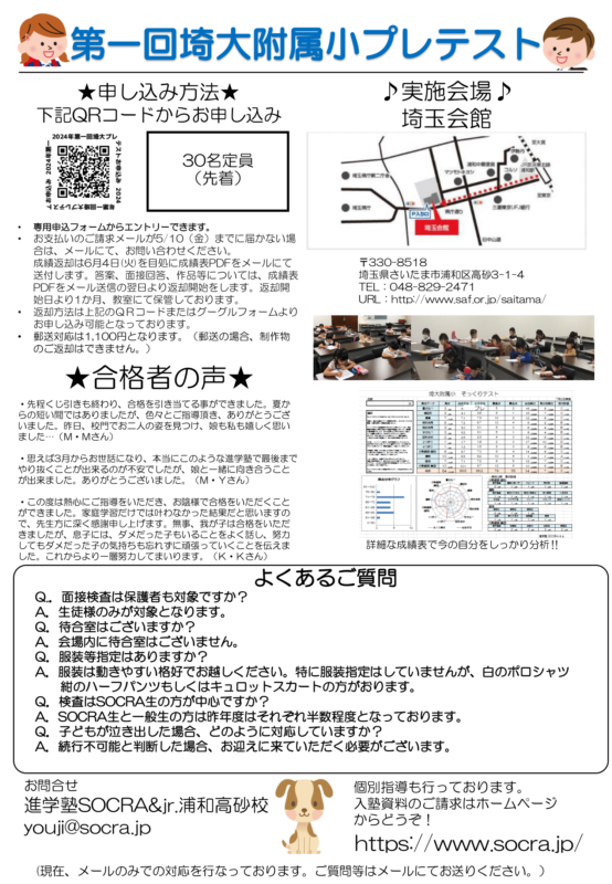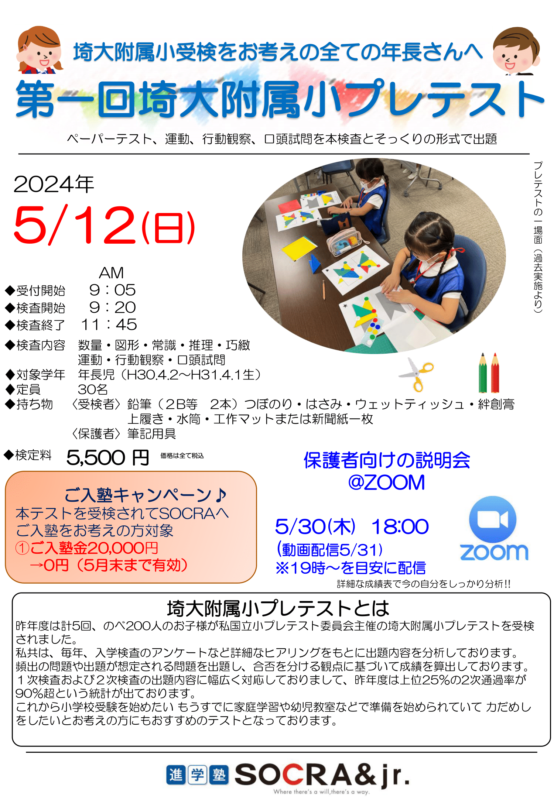 【浦和高砂校】第一回埼大附属小プレテスト開催のお知らせ【年長児】