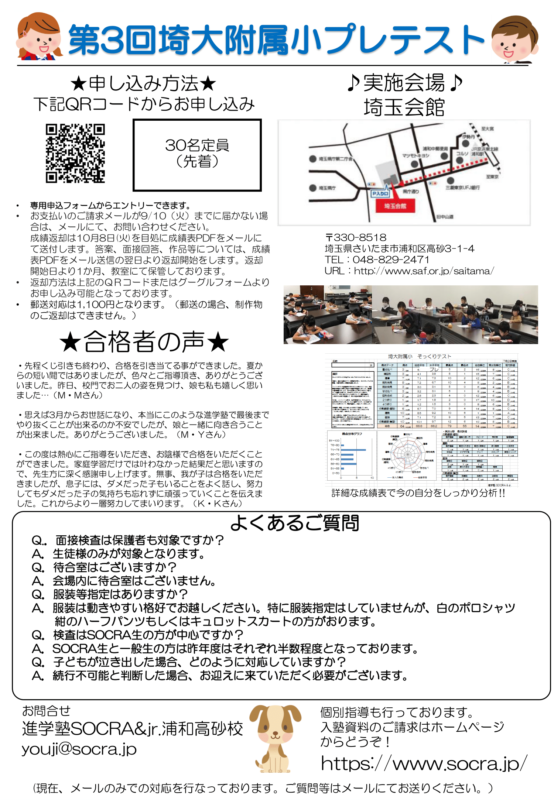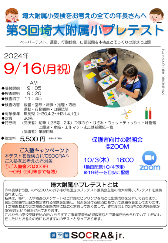 進学塾SOCRA&jr.では、今年受験を迎える年長さんを対象に、「第3回埼大附属小プレテスト」を実施いたします。 本番を想定してのペーパー、制作、運動、行動観察、口頭試問を行います。 頻出の問題や出題が想定される問題を出題し、合否を分ける観点に基づいて成績を算出しております。本番まであと約3カ月、家庭学習や幼児教室などで準備を始められていて 力だめしをしたいとお考えの方におすすめのテストとなっております。 会場は埼玉会館会議室にて実施いたします。