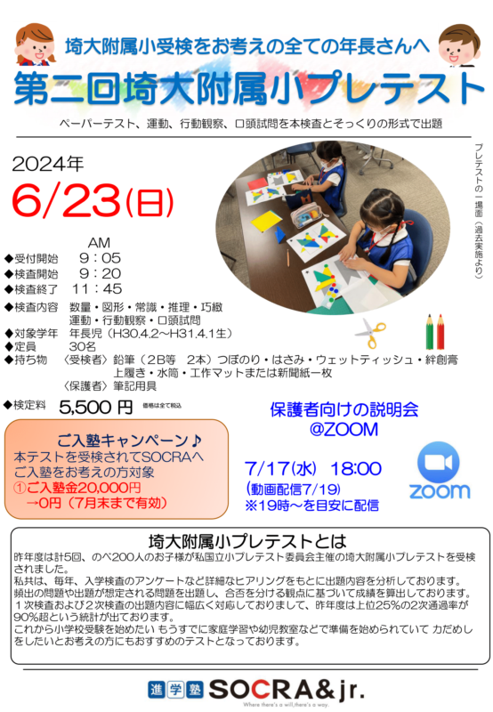 進学塾SOCRA&jr.では、今年受験を迎える年長さんを対象に、「第2回埼大附属小プレテスト」を実施いたします。 本番を想定してのペーパー、制作、運動、行動観察、口頭試問を行います。 頻出の問題や出題が想定される問題を出題し、合否を分ける観点に基づいて成績を算出しております。 これから小学校受験を始めたい もうすでに家庭学習や幼児教室などで準備を始められていて 力だめしをしたいとお考えの方にもおすすめのテストとなっております。 会場は埼玉会館会議室にて実施いたします。