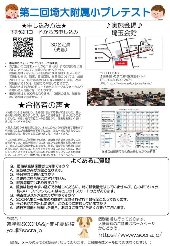 【浦和高砂校】第2回埼大附属小プレテスト開催のお知らせ【年長児】