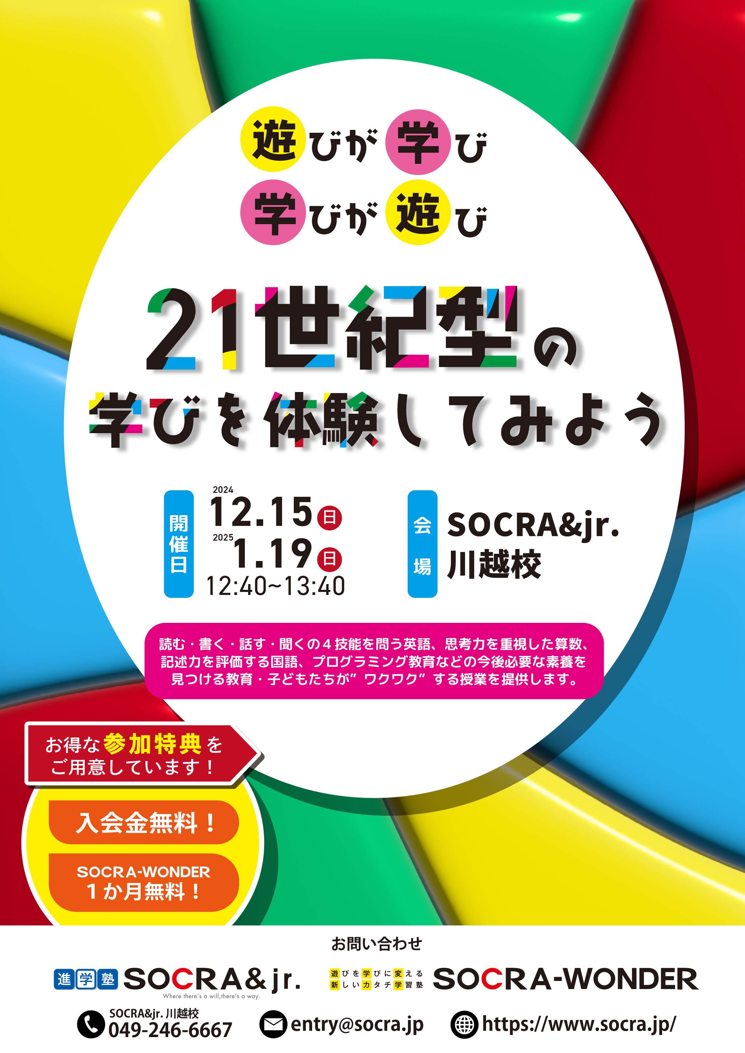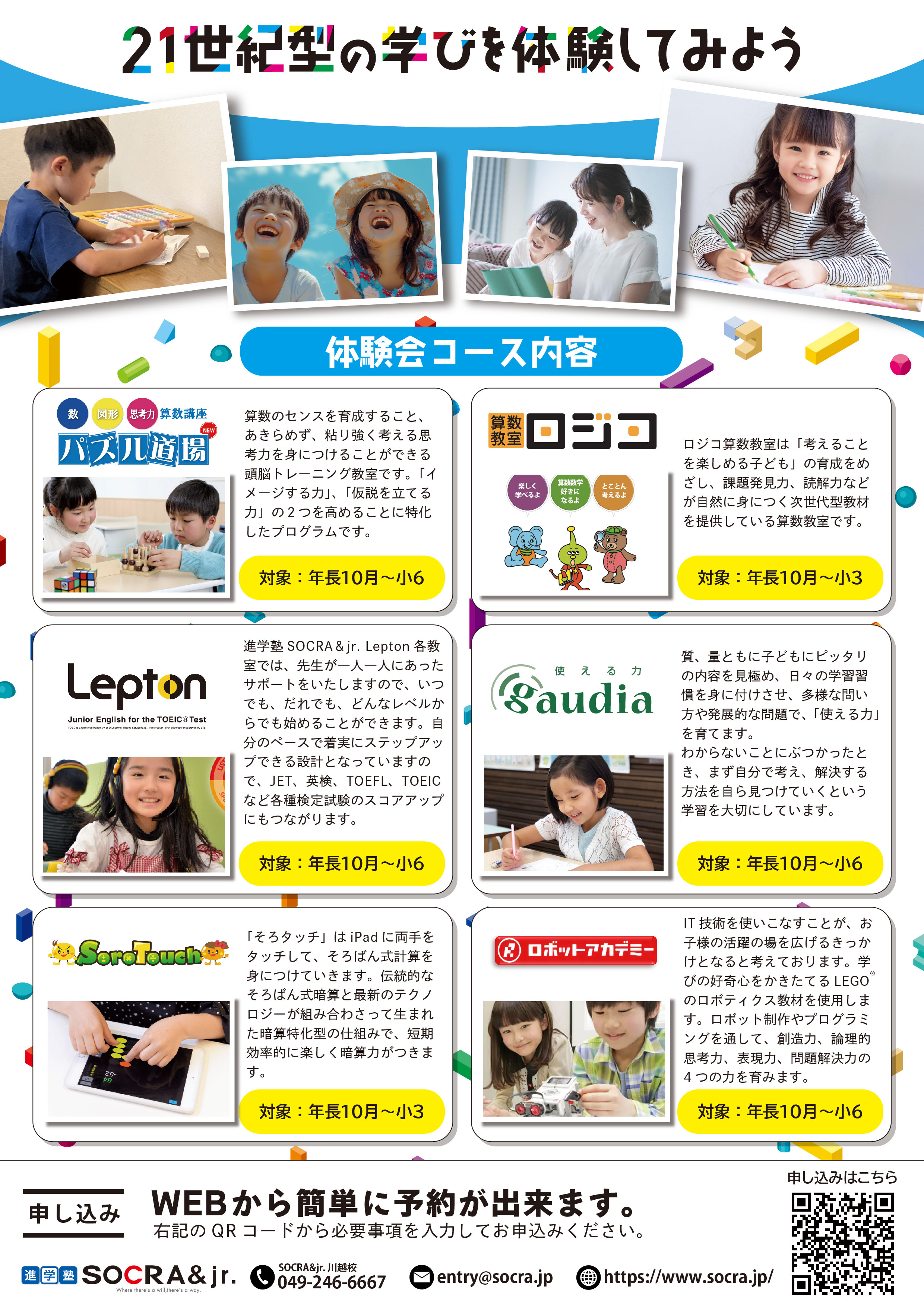 現在年長児~小学生のお子様に向けて、進学塾SOCRA&jr.川越校では